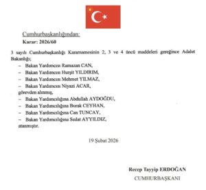 Recep Tayyip Erdoğan imzasıyla yayımlanan Cumhurbaşkanlığı Kararı (2026/60) ile Adalet Bakanlığı’nda önemli görev değişiklikleri yapıldı.